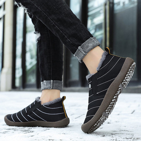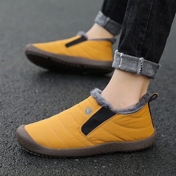 1. Adult unisex slip on flat warm shoes that offer a sleek and modern silhouette but still offer easy on and off. Topped off with a nice layer of waterproof cloth.