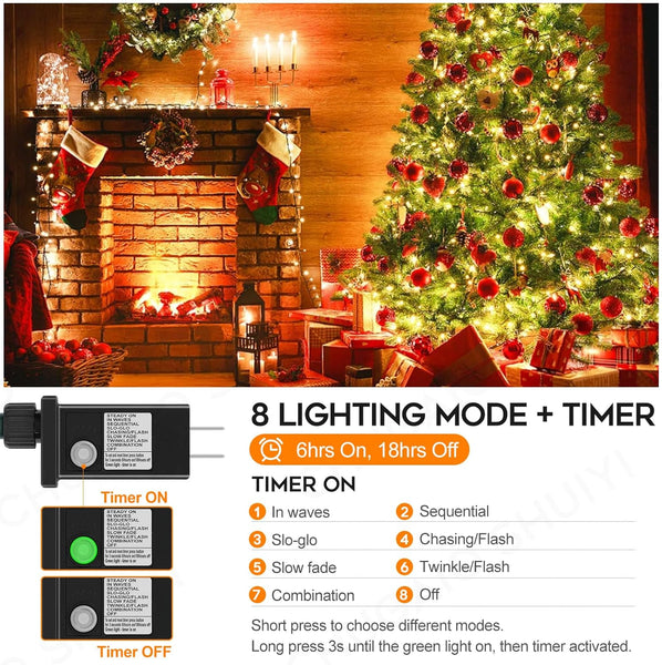 - 8 Lighting Modes & Timer Function: Brightify Christmas lights including combination, in waves, sequential, slogs, chasing/flash, slow fade, twinkle/flash, steady on, switch the lighting modes by pressing the round button on the plug.christmas tree lights have “6h on, 18h off” timer, press the button for 3 seconds to set and reset the timer. The green light is ON means the timer is ON