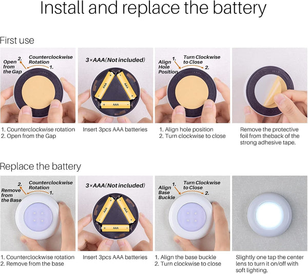 Battery Operated: Each stick on light is powered by 3 AAA batteries (not included). Wireless lighting, uncomplicated and safe, no worries about the risk of electric shock to children. For extended use, we recommend using rechargeable NiMH AAA batteries