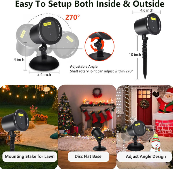 [Easy To Set Up And Install] The christmas projector lights outdoor waterproof comes with a stand that screws into the bottom and or stake that can also screw into the light. 270 degrees rotatable adjustable head will provide you with the best projection effect. Unlike some other laser christmas lights outdoor projector you don't have to press a button for the motion feature to work, just stake it in the lawn, plug it in, and it starts the show. This christmas laser light is great for quickly decorating your house for the holidays.
