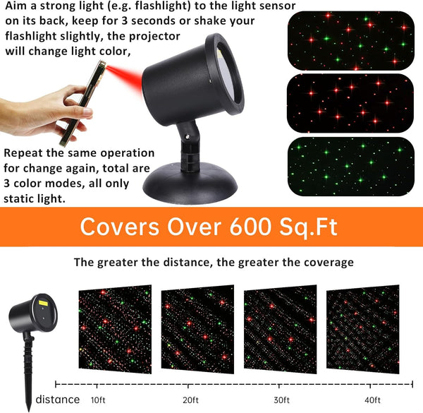 [Outdoor Garden Laser Projection Light] The christmas laser light projector is static type, its light will not rotate. It has a very wide coverage area, can shining 600 square feet max, projects up to 100 yards away, as seen on TV Xmas Light. The christmas projector lights outdoor passed thousands times tests, christmas laser light is safe and low power consumption. The xmas projector lights outdoor can turn on/off automatically according to the light intensity, no need remote or timer. Whether adorning your home, garden, or any event venue, this christmas projector outdoor is a standout addition, making celebrations truly memorable.