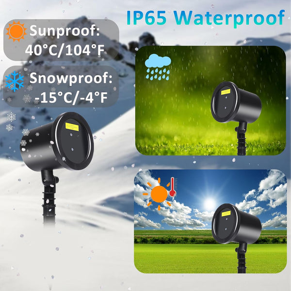 [IP65 Waterproof & Perfect for Outdoor Use] The outdoor projector christmas lights is waterproof and the eyebrow shade on the top of the projector - protecting christmas laser light from inclement weather. The outdoor projector christmas lights for house also can works in winter -20 degrees centigrade because of its internal active heater, just need to wait a few more seconds to let christmas projector lights warm up itself, then christmas laser projector will turn on.Rain or shine it’s working fine.