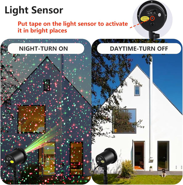 [Built-in Light Sensor] Christmas outdoor projector lights without any remote or timer, it is auto-controlled type. It will automatically shut off in brightness, no need to plug in everyday, The christmas laser light automatically turns on automatically at dawn. You can cover its back sensor when you want projection christmas lights to works long time(so, when you test it in bright house, please cover its light sensor).This projector christmas lights saves you the trouble of turning lights on and off and christmas laser projector saves the time and effort of hanging lights. Christmas seasonal lighting decoration creating a mysterious starry effect