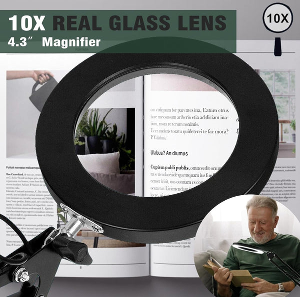 - 【10x HD Magnification & Real Glass Lens】Magnifier with light is professionally designed with a 4.3" diameter real glass lens, magnifying tiny objects up to 1000% without optical distortion. It's truly born for intensive and intricate work. A perfect choice for reading/viewing small prints, sewing, repairing, carving, manicure, soldering ect. It is designed for people who need to work continuously at close range or who need visual aids.