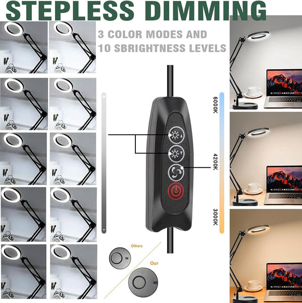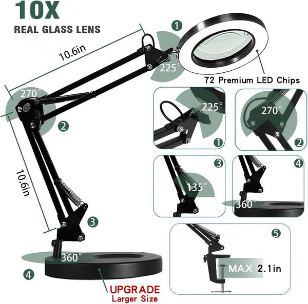 - 【3 Color Modes & Adjustable Brightness 10-Levels 】Magnifier with light and stand has 72pcs high-brightness LED lamp beads with an up of 12.6W &1800 lumens. It's designed with 3 color modes (white, warm, and cool) and 10 levels of brightness, you can easily adjust the level of brightness between 10% and 100% to suit your different work scenarios.