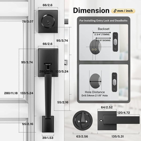 ADJUSTABLE LATCH DESIGN FOR INSTALLATION: Brightify Matte Black Front Door Handles with 2 3/8"(60MM)- 2 3/4"(70MM) adjustable backset latch and double-screw bolt design, help you fit the hole spacing with the door Easily!