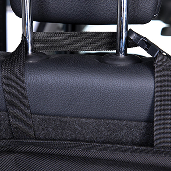 4. Simply hang the storage bag to the backseat headrest and select the desired hanging height with three adjustable buckle straps, then attach the fasten tapes to the backseat firmly.