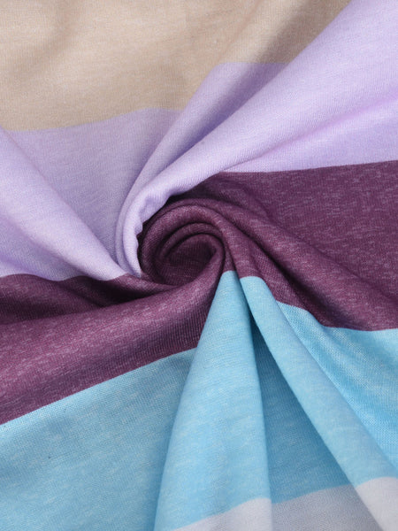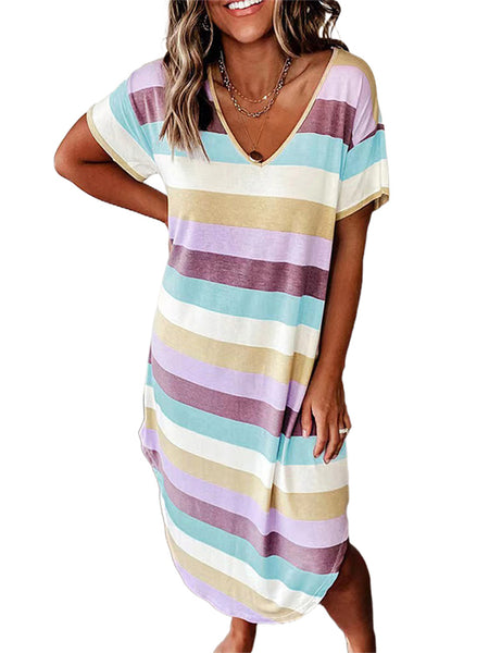 - Design - Striped Color Block Long Dress, Short Sleeve Long Dress, Boho Curved Hem Dress, Beach Sundress, Trendy and Elegant