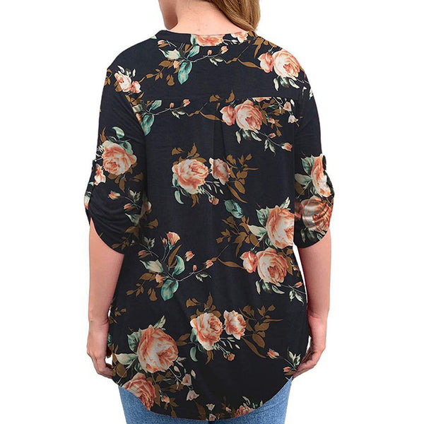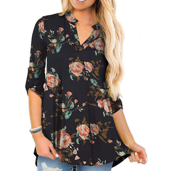 Floral Printed V Neck Long Sleeve T-Shirt For Women Pullover Blouse Tops Tunic Tee