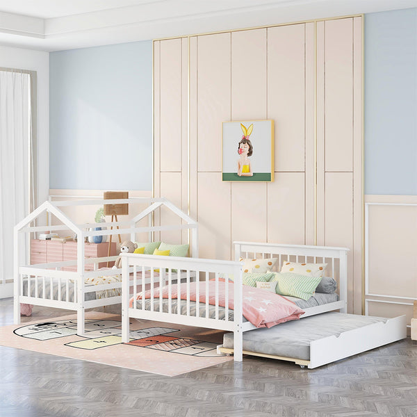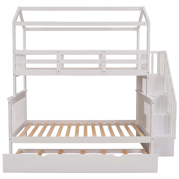 Gplesas Twin Over Full Wood Frame Bunk Bed With Storage Staircase,Bunk Bed With Trundle and Staircase,Kids House Bed With Roof,3 Piece Platform Beds,Children Floor Bed With Guard Rail White