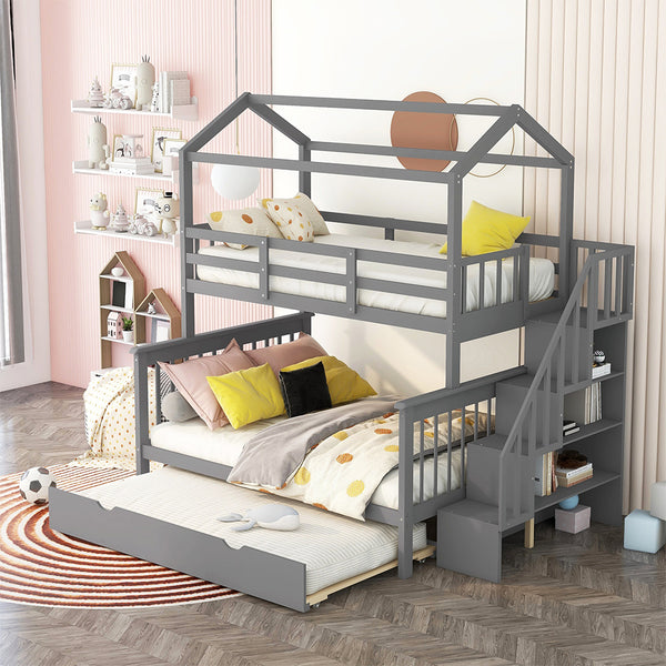 Bunk beds are the ultimate space saver for your room, whether share with a sibling or are constantly hosting sleepovers. This house bunk bed has a classic clean-lined design, perfect for traditional aesthetics. It is crafted of solid pine wood in a neutral hue with a twin-over-full design. It features one under-bed trundle, an attached staircase for easy access. And the bed can also be separated into three separate platform beds.The storage space inside the staircase is perfect for people who likes space saving effectively!(Product is not suitable for children or infants under the age of 6!)