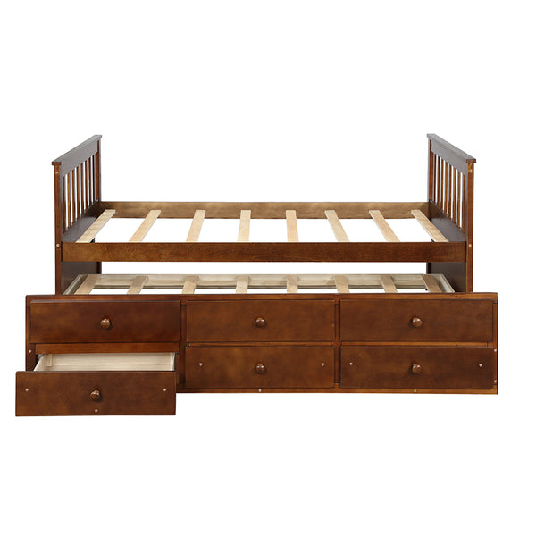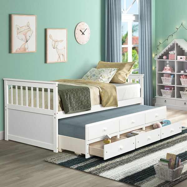 3. THREE IN ONE - Three drawers built into the trundle provide even more storage while the trundle bed underneath the twin bed features hideaway for space saving purpose and could be pulled out to serve as a guest bed when need be.