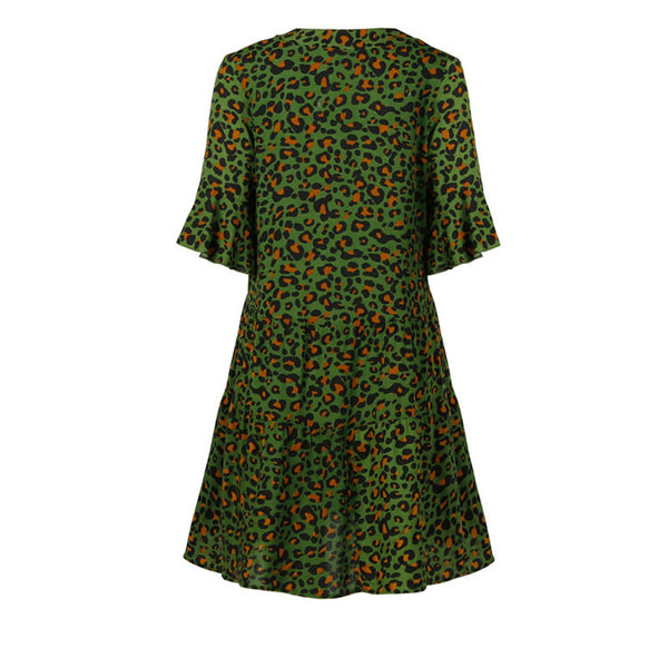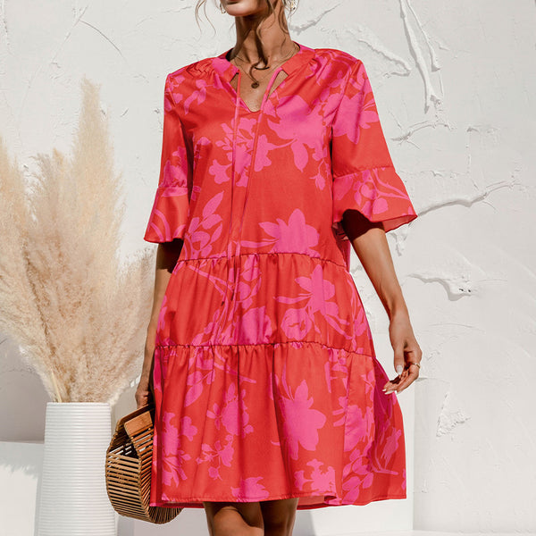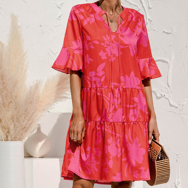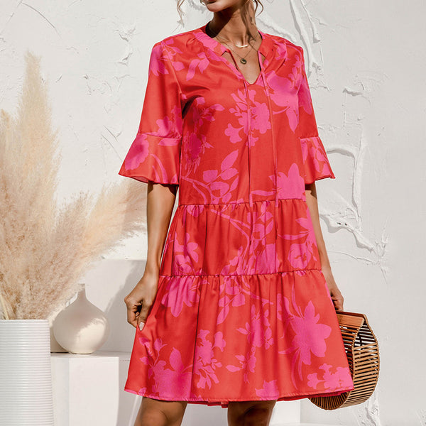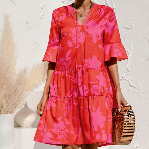 Ladies V-neck Flared Short Sleeves Cake Splicing Color Printed Casual Midi Dress