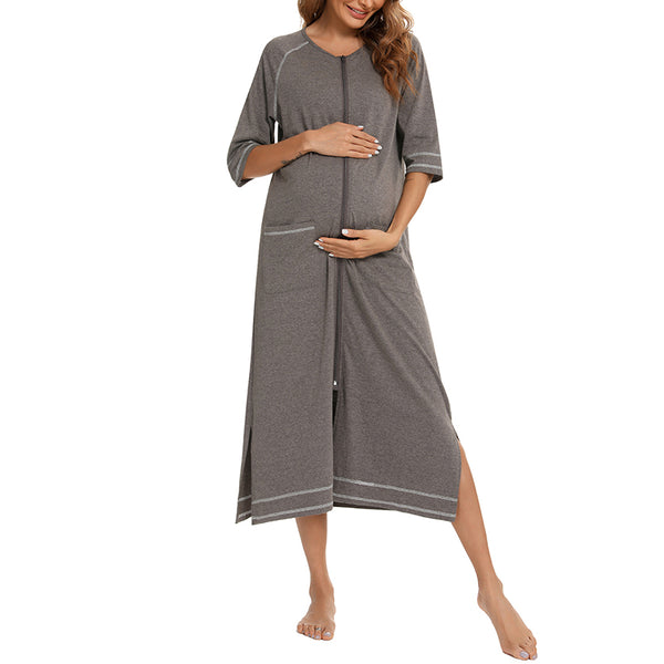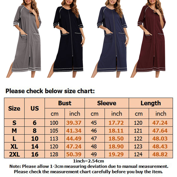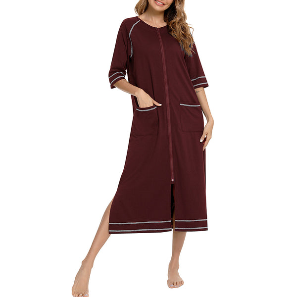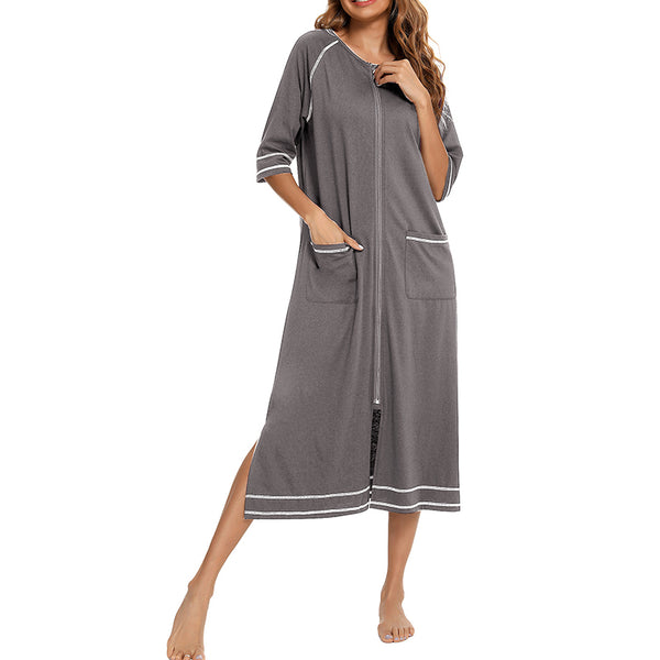 Style: Women Zipper Home Clothes Nightdress Half Sleeve Casual Pockets Loose Long Dress