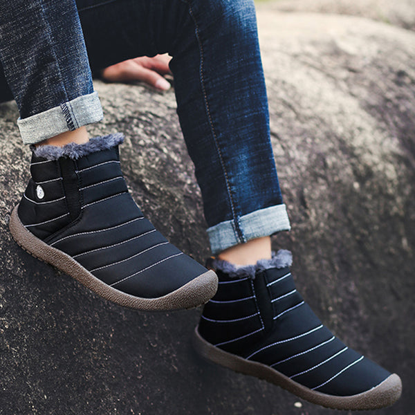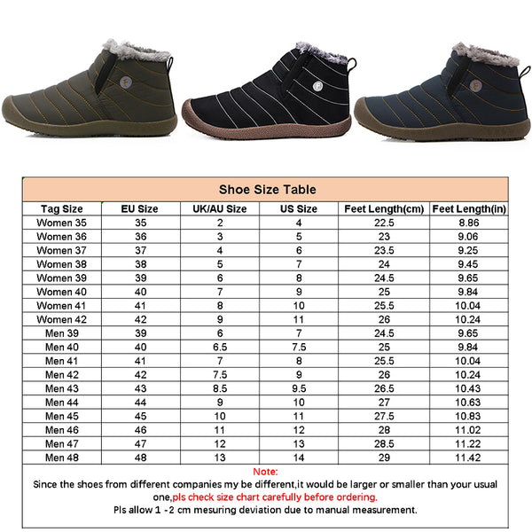 1. Adult unisex slip on winter warm flat shoes that offer a sleek and modern silhouette but still offer easy on and off. Topped off with a nice layer of waterproof cloth.