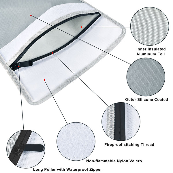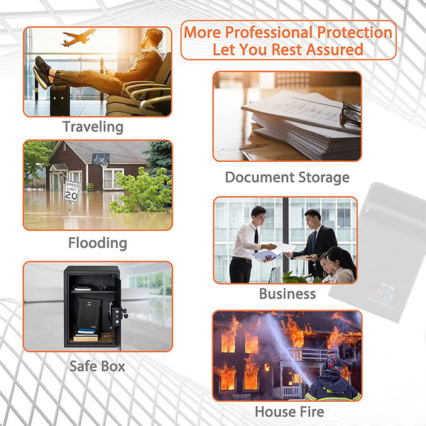 4. Our fire safe document bag is the perfect design to travel with and store safely and conveniently. Fireproof money pouch is super easy to grab and carry no matter at home or on office. Combining a fireproof bag and fireproof safe box together is the best solution to offer your documents and valuables a complete protection in any fire accident.