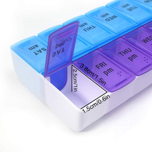 2. Easily see whether you've taken your medication with this easy-open, 2 times a day pill organizer for all 7 days of the week. This sturdy plastic pill box lets you organize vitamins or medication by time of day and day of the week.