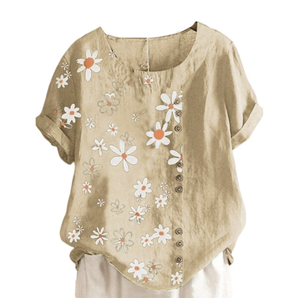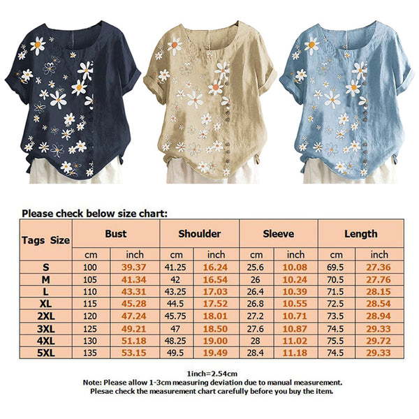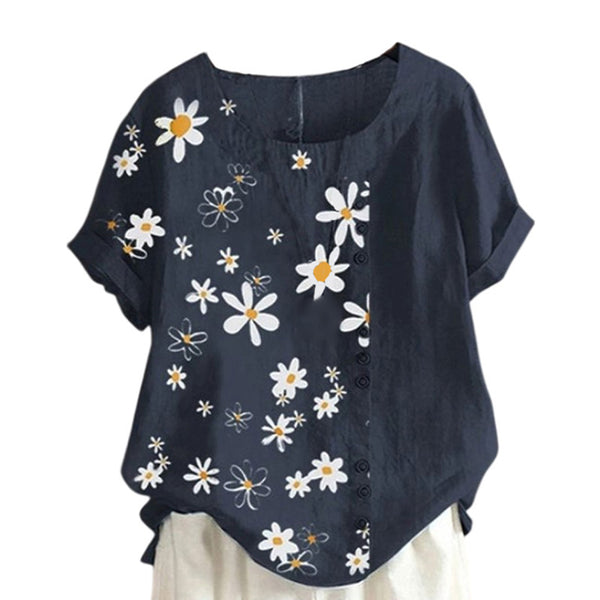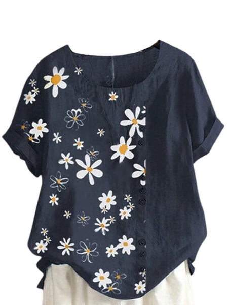 Women Crew Neck T-Shirt Daisy Printing Ruffles Short Sleeve Top Blouse Pullover