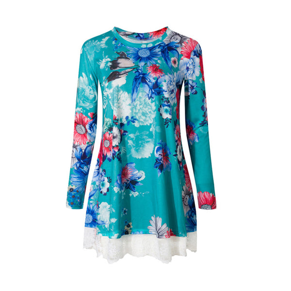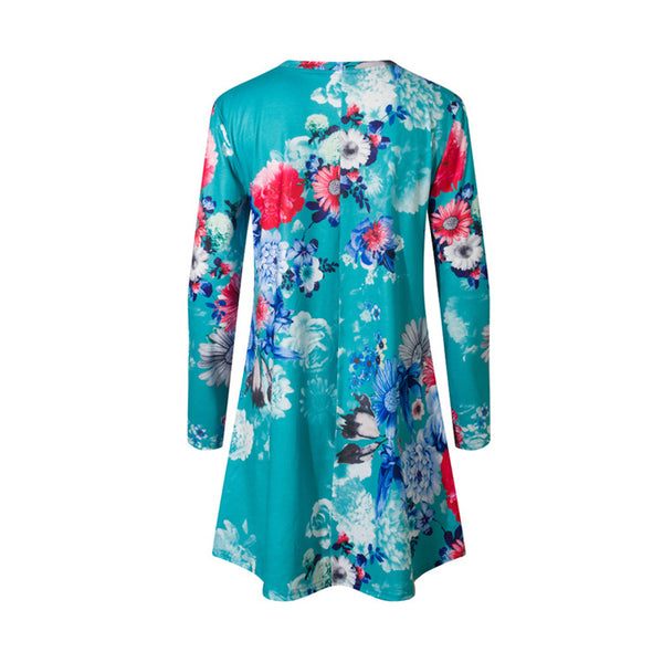 Style: Women Floral Print Loose Lady Long Sleeve Mini Dress Round Neck Big Hem Dress