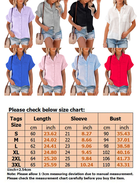 Women Lapel Top Short Sleeve Solid Color T-Shirt Blouse Casual Pullover Button