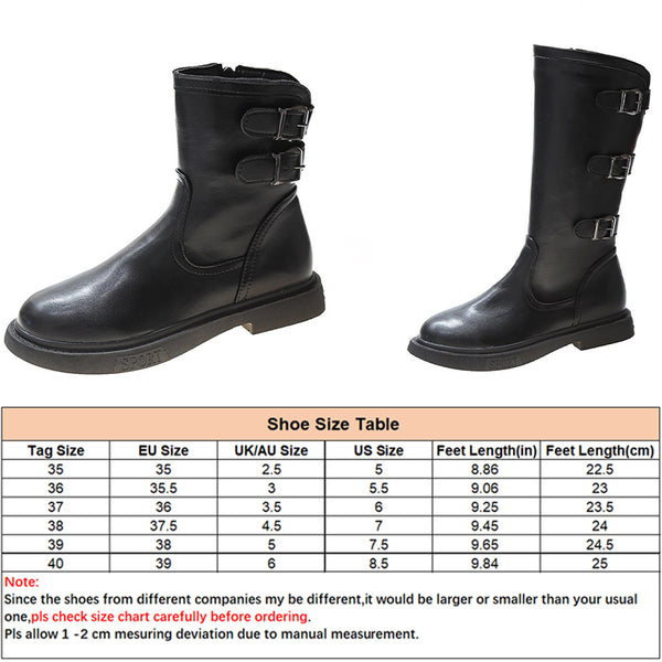 2. These boots feature a solid color, buckle and flat chunky heel.
