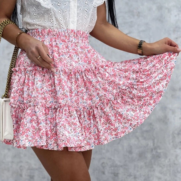 3. Feature: Women Floral Print Boho Short Skirts, Ruffled Hem Mini Skirts, Casual Lightweight Flowy Short Skirt, High Waist Stretchy Skirt