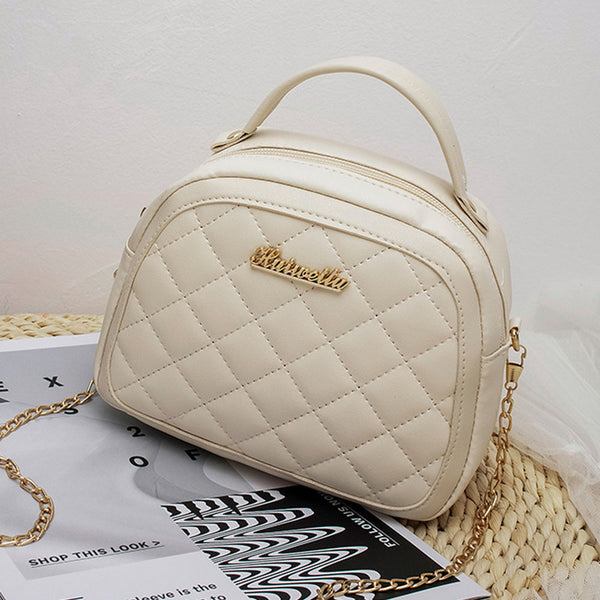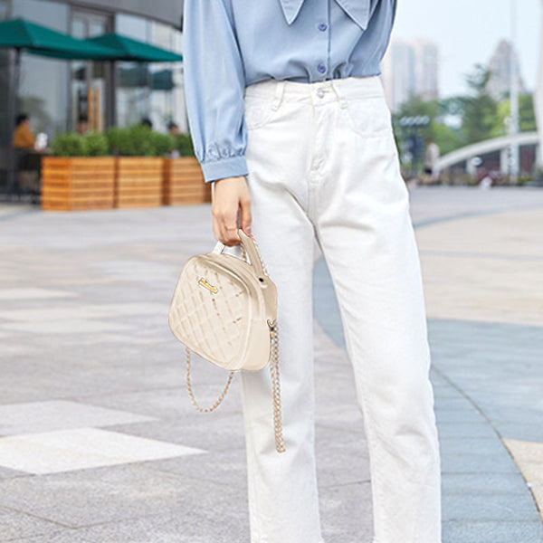 1. Look elegant and stylish with this beautiful crossbody quilted purse. This women's bag features a luxe quilted exterior and long shoulder chain strap detail to rest comfortably on your shoulder. Detailed with fabric lining and gold tone hardware.