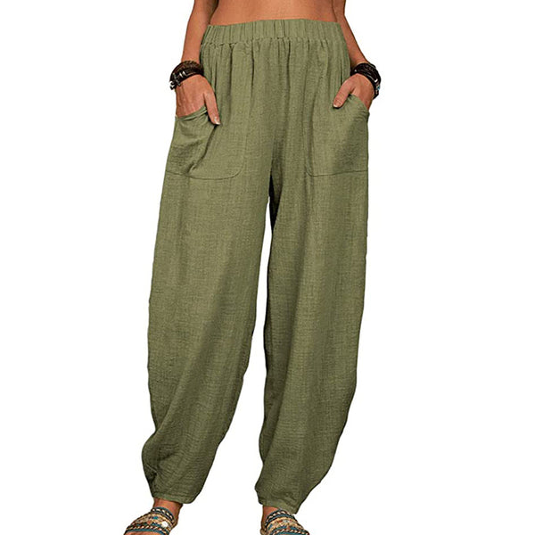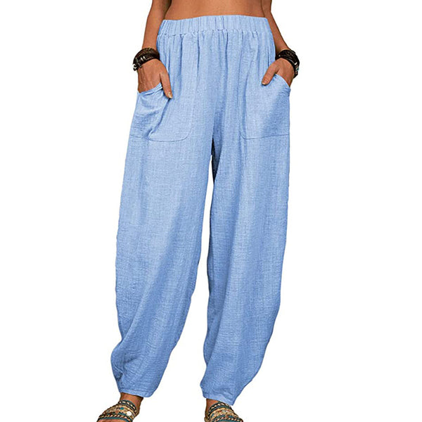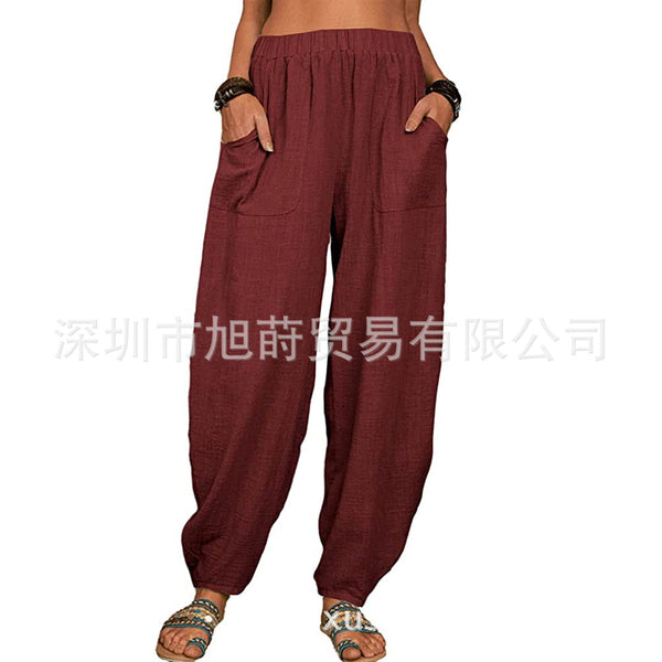 2. Women's casual loose pant solid color simple wide-leg elastic waist loose fit ankle length pants with two side pockets.