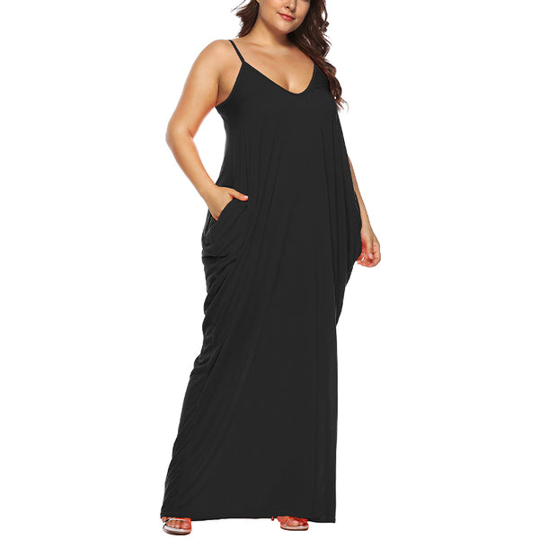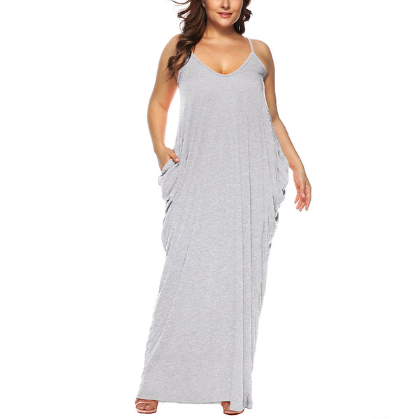 Women Solid Plus Size Sleeveless Maxi Dress V Neck Summer Spaghetti Straps Dress Double Side Pocket
