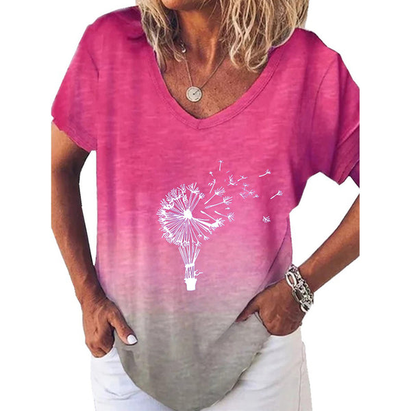 Style: Women V Neck Top, Summer Gradient Blouse, Dandelion Print T-Shirt