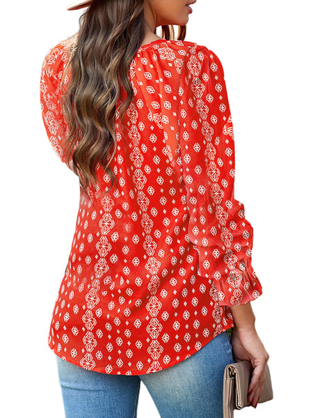 Women's Floral Print V Neck Loose Fit Long Lantern Sleeve T Shirts Pullover Tops
