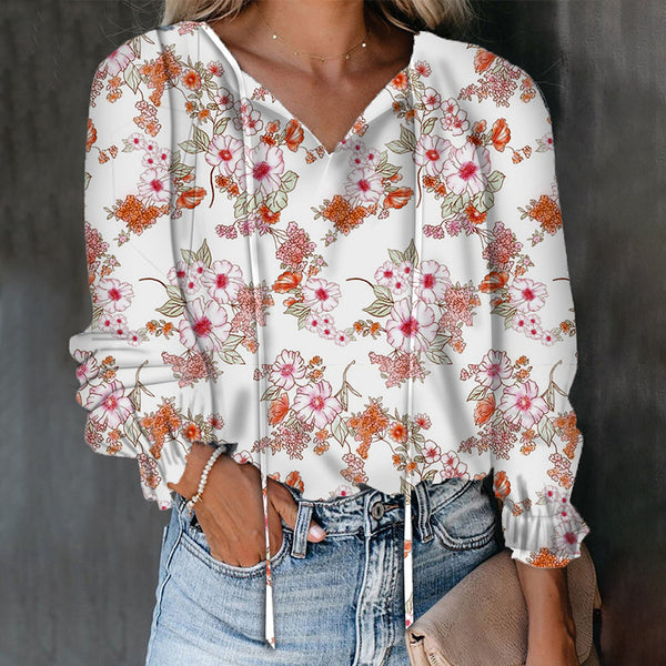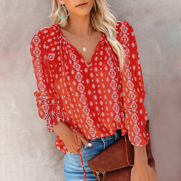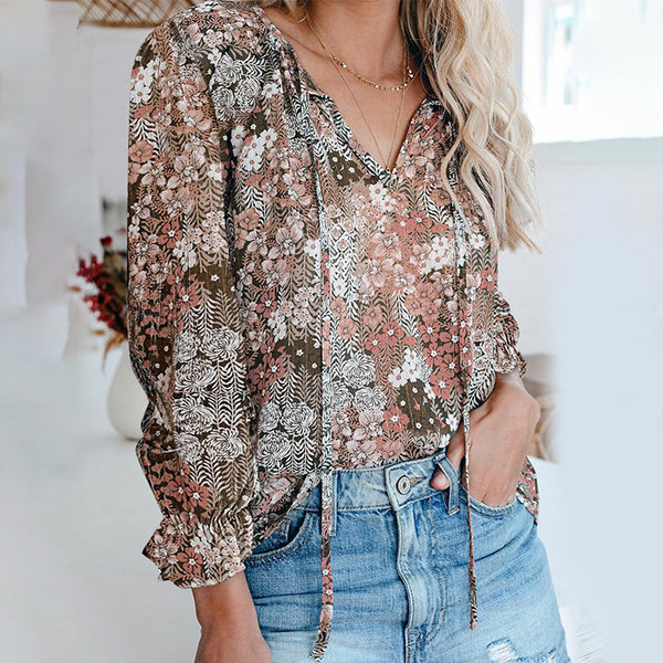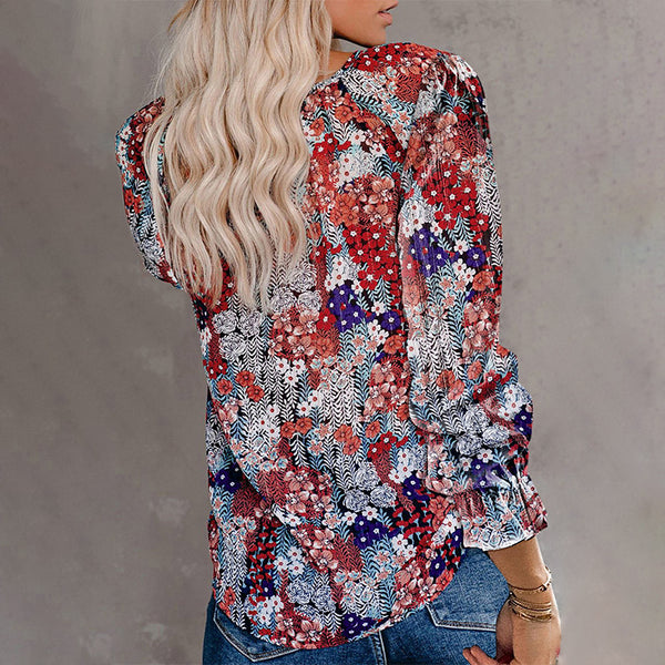 Women's Floral Print V Neck Loose Fit Long Lantern Sleeve T Shirts Pullover Tops