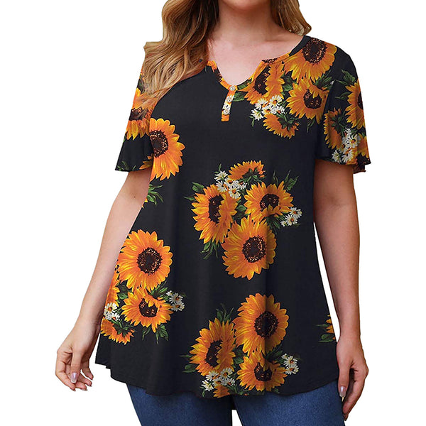 Style: Womens Flower Print Buckle Small V Neck T-Shirt