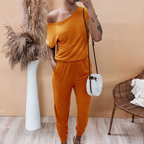 Style: Women Elastic Waist Long Pant Playsuit, Women Loose Fit Casual Romper, Women Solid Color One Piece Jumpsuit